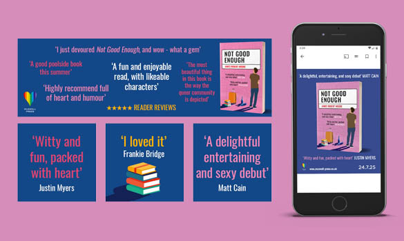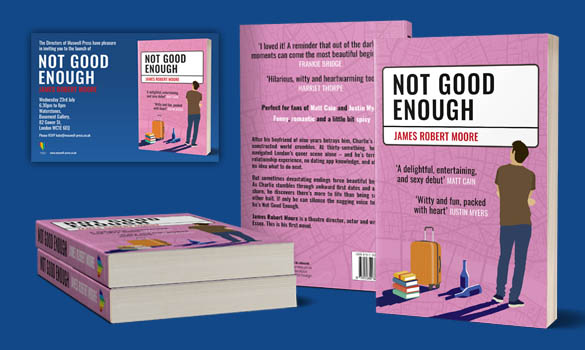 We were commissioned by Muswell Press to design a cover for a gay rom-com by debut author James Robert-Moore. We also supported the launch of the book by creating Amazon A+ graphics, efooters and social media graphics.